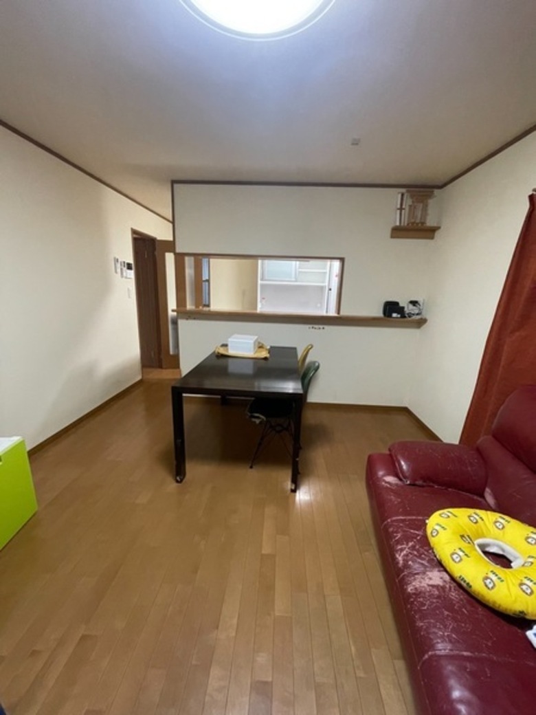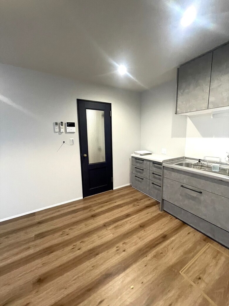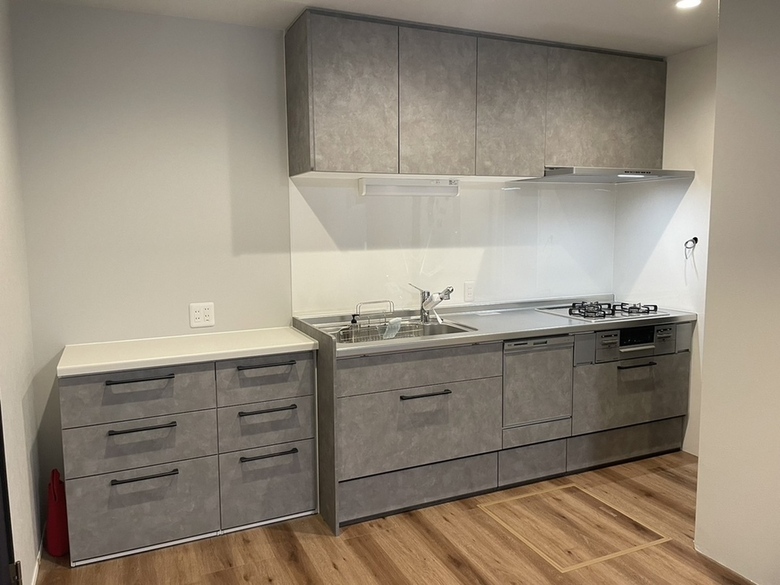 木目調のフローリングにグレーのキッチンで高級感のあるLDKに変わりました!