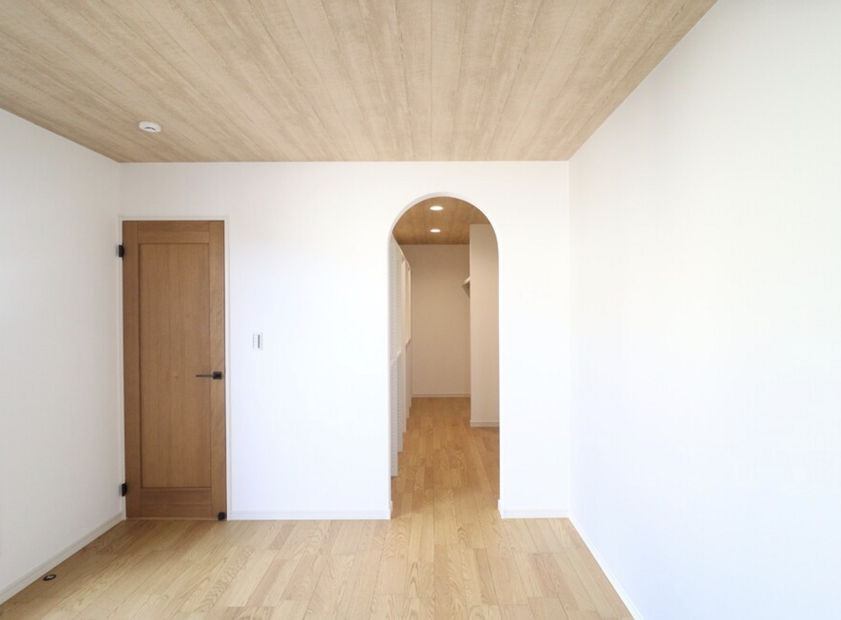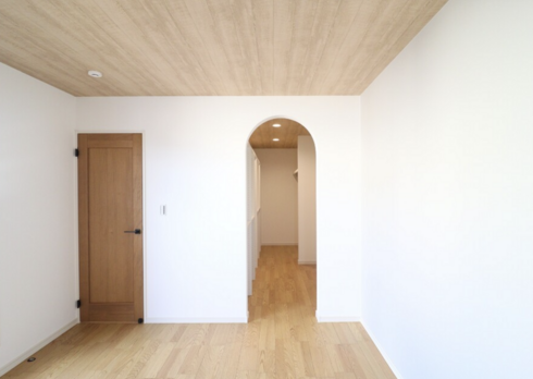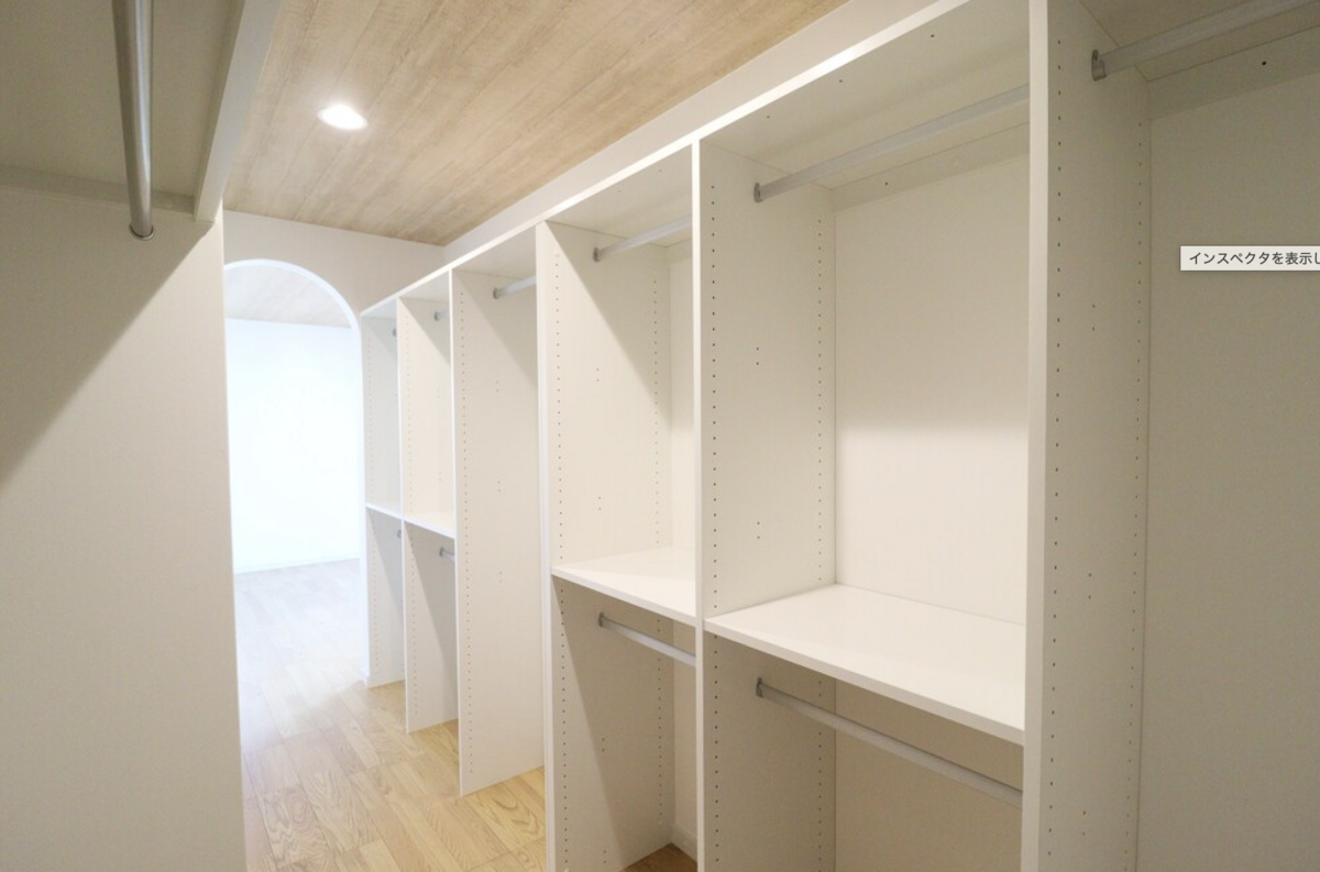 洋服以外に様々なものを収納できるよう、ハンガーバー以外にたくさんの棚を設置。収納するものに合わせて棚板の高さを変えられるようにしています。アーチ状の入り口にすることで、外から見た時のおしゃれさもUP!