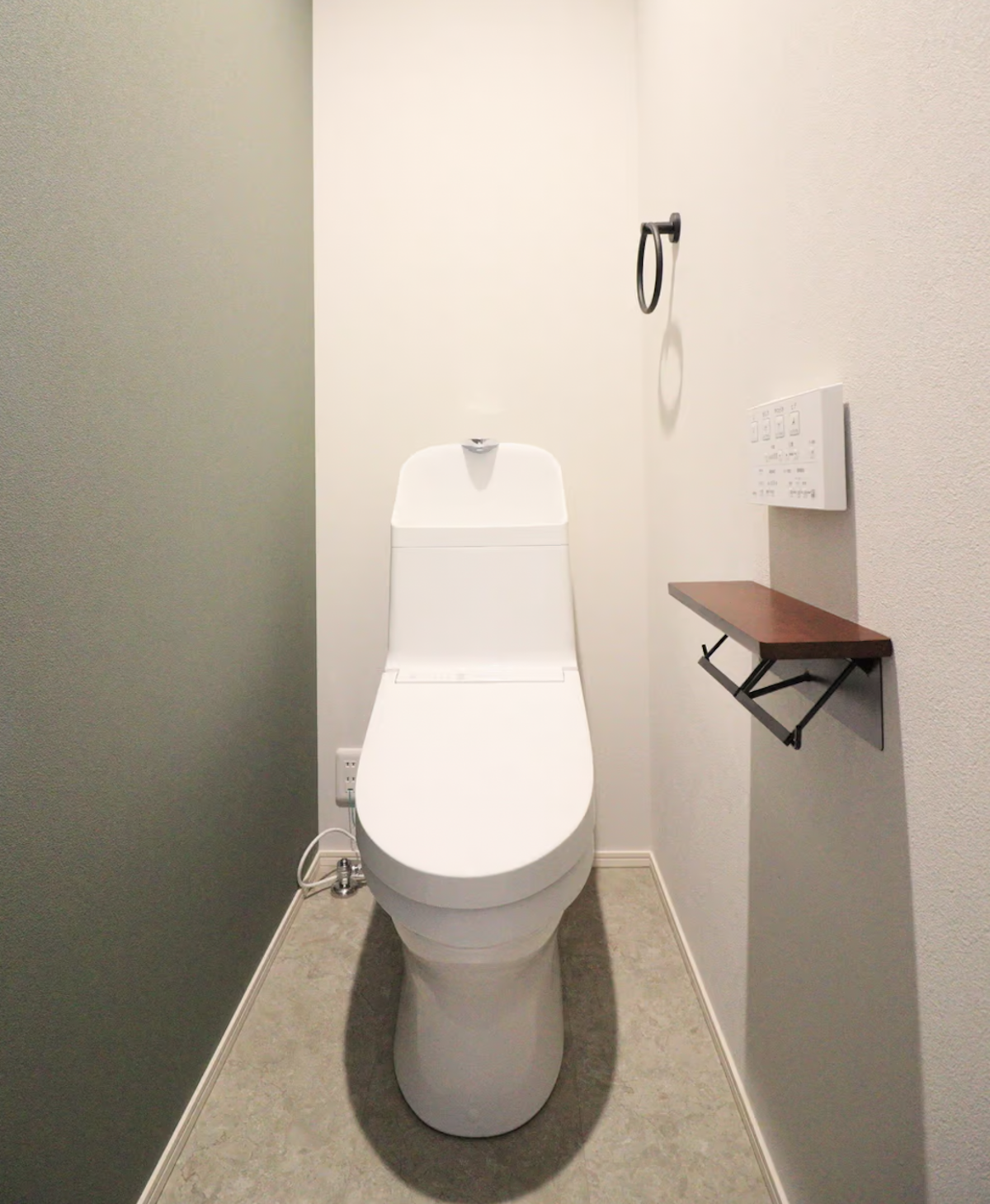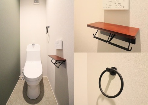 壁紙の一部を落ち着いたグリーンに張り替え、タオルハンガー・トイレットペーパーホルダーを黒アイアン製のものに変更することで、全体的に落ち着いた、おしゃれな雰囲気に仕上げました。