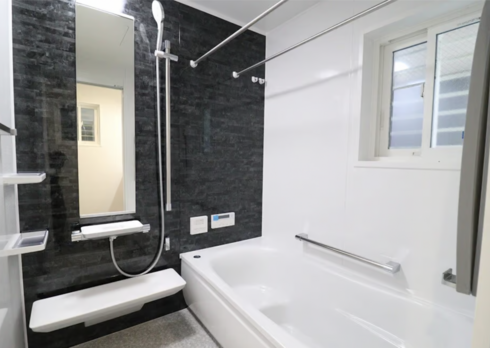 「使い勝手のいい」という部分にポイントを置いていらっしゃったので、シャンプー・石鹸や掃除道具などを置くための棚を多めに配置しました。物干し竿を設置するためのホルダーも4ヶ所設置することで、物干し竿を使わない時は端に寄せる、浴室内に洗濯物などを干す際は手前のホルダーに置く、などその時その時の状況に合わせて物干し竿を移動させられるようにしています。また、お家全体で黒の壁をアクセントとして取り入れていたので、浴室も同じように黒い壁を一面採用しました。